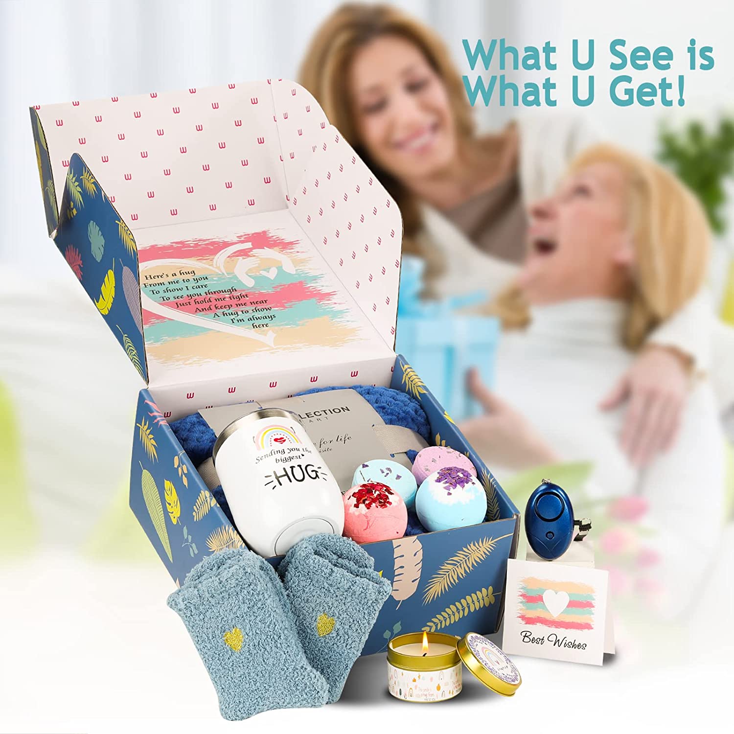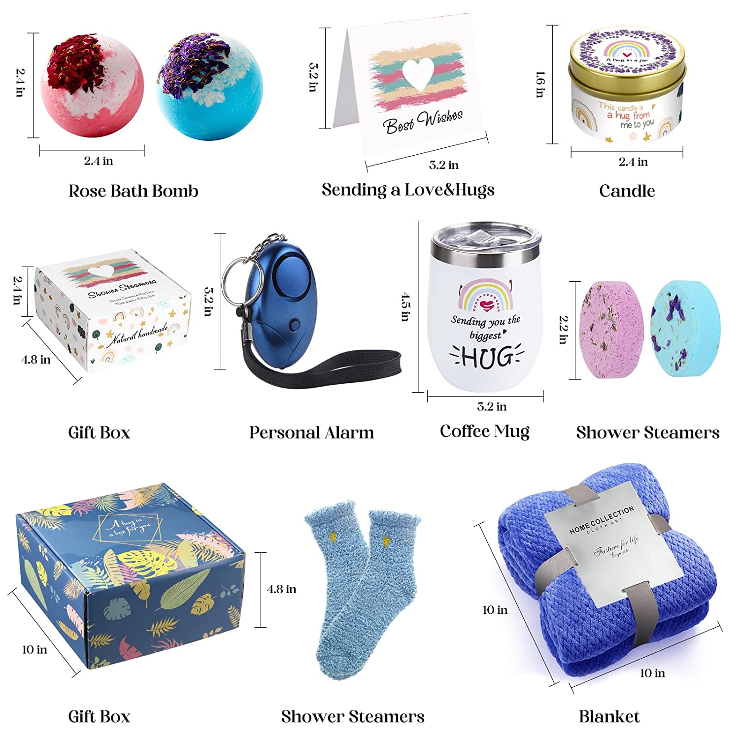 - SEND A GET WELL PACKAGE: Here we will convey your mourning and concern, provide a thoughtful gift box, which includes 1*Blanket,1*12 oz Insulated Tumbler,1*Fuzzy socks,1*Personal Alarm, 1*lavender scented candles,1*all-natural handmade rose soaps,1*rose bath bomb,1 x Sending love & hug notes card,1*Shower Steamens sets.